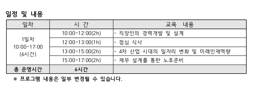 교육 주제는 '직장인 경력개발 및 설계', '4차 산업 시대의 일자리 변화 및 미래 인재 역량', '노후 준비를 위한 재무설계'입니다.