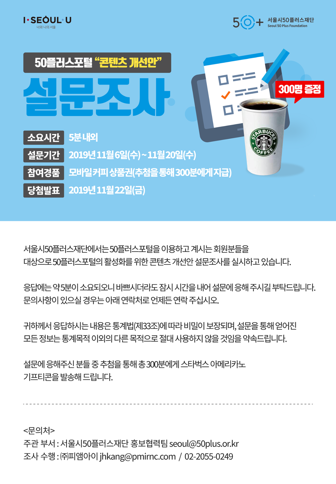 50플러스포털 '콘텐츠 개선안' 설문조사에 참여하고 커피 상품권 받으세요!