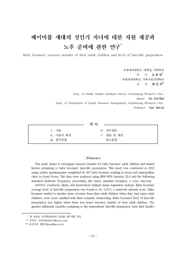 • 성인 자녀에 대한 경제적 부양 부담으로 자신을 위한 노후준비를 미흡하게 한 베이비붐 세대를 대상으로 이들의 성인기 자녀에 대한 자원 제공이 노후준비도에 미치는 영향을 분석한 연구.