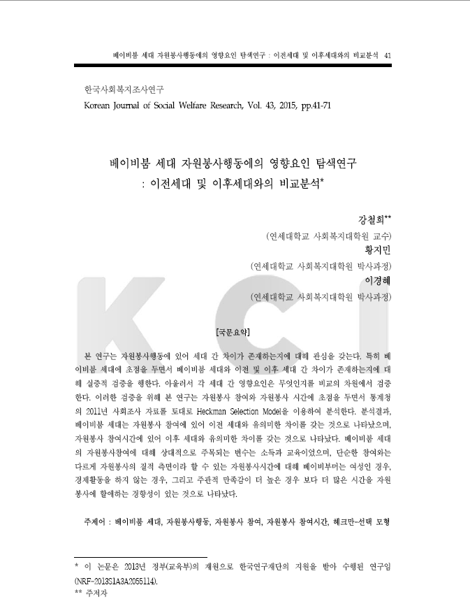 세대 간 자원봉사 행동에 차이가 존재하는지에 대한 관심에서 시작된 연구. 특히 베이비붐 세대와 이전 및 이후 세대 간 차이가 존재하는지 실증적으로 검증하고 각 세대의 영향요인은 무엇인지 비교하며 검증함.