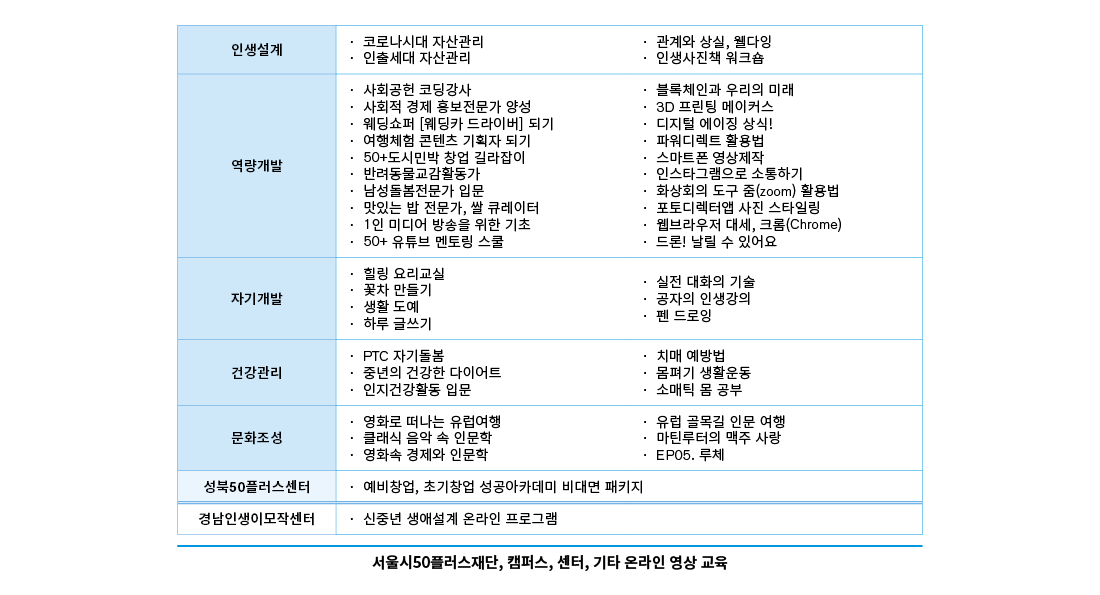 포스트 코로나 시대의 새로운 변화에 대처하기 위한 50+유관기관들의 화상회의, 온라인강좌 등 비대면 방식 50+세대의 일‧활동 지원내용을 모아 보았다.